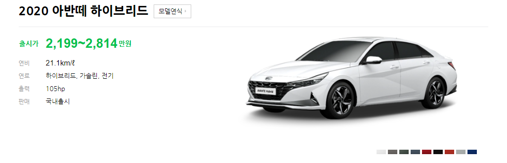 최신 2020 올 뉴 아반떼 하이브리드 가격 가격표 연비 제원 색상