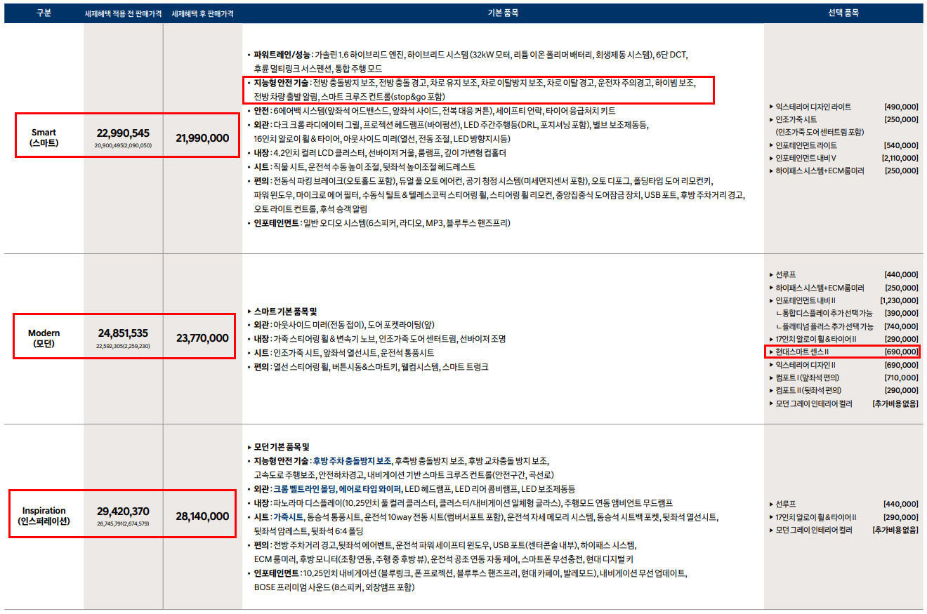 2020 올 뉴 아반떼 하이브리드 스마트 - 22,990,545, 모던 - 24,851,535, 인스퍼레이션 - 29,420,370만원 입니다. 기본 트림인 스마트에 현대스마트 센스1이 포함 되어 있습니다. 각 트림에서 차이점 중 추가 옵션 스마트센스1,2의 유무가 있습니다.