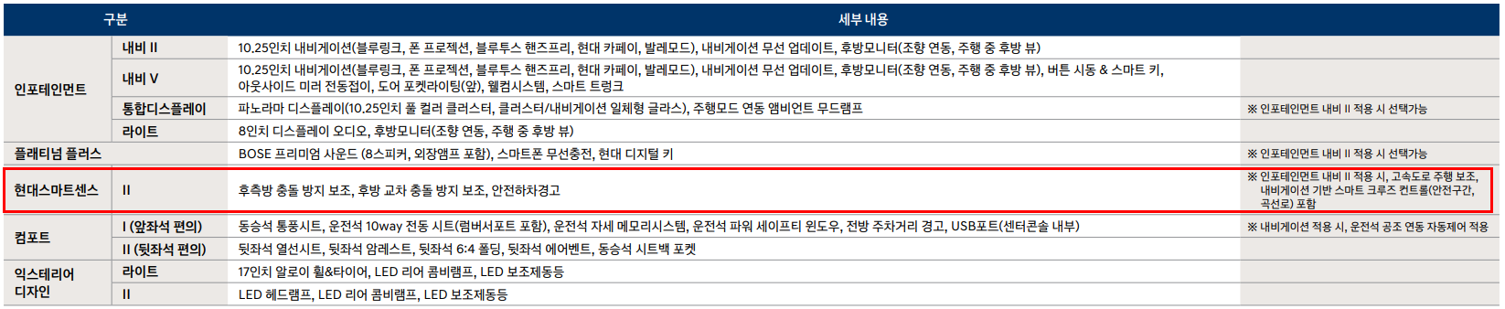 개인적으로 하위 트림에 현대 스마트센스2를 옵션으로 넣으시면 고사양 트림의 기능을 사용할 수 있습니다. 특히 후측방 충돌방지 보조, 후방 교차 충돌방지 보조 등 운전자의 안전성을 높이는 기능으로 추천 드립니다.