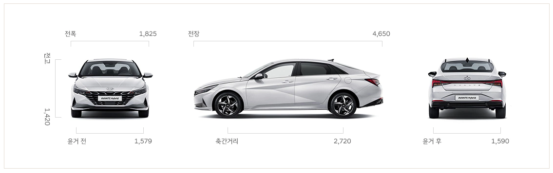 2020 아반떼 하이브리드 제원에 대해서 알아보겠습니다. 전장 4,650 전폭 1,825 전고 1,420 입니다. 엔진은 G1.6 하이브리드 엔진을 사용하고 있습니다.