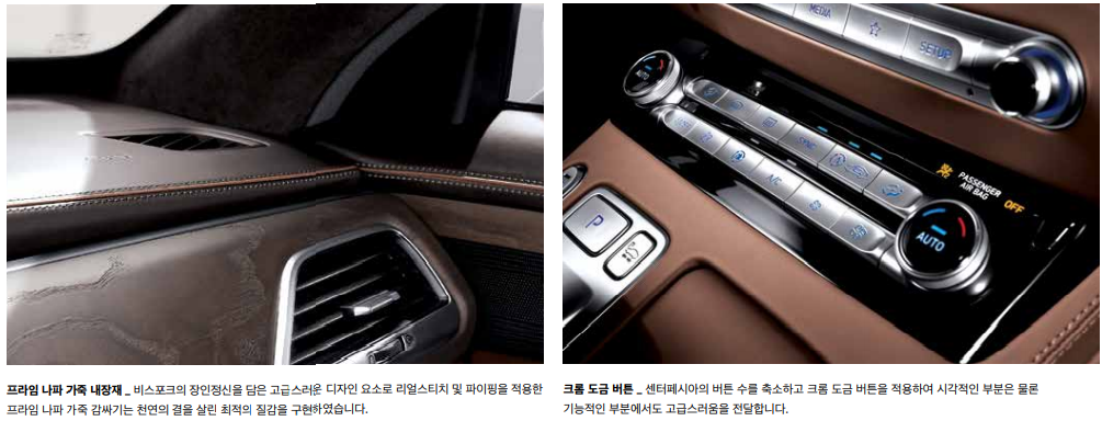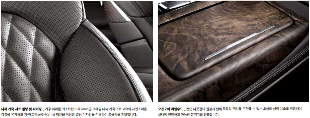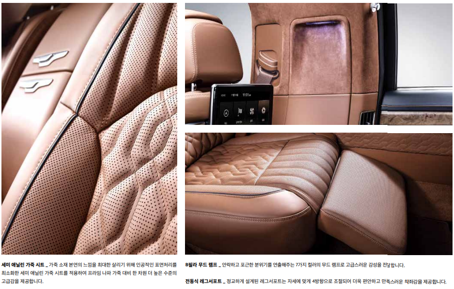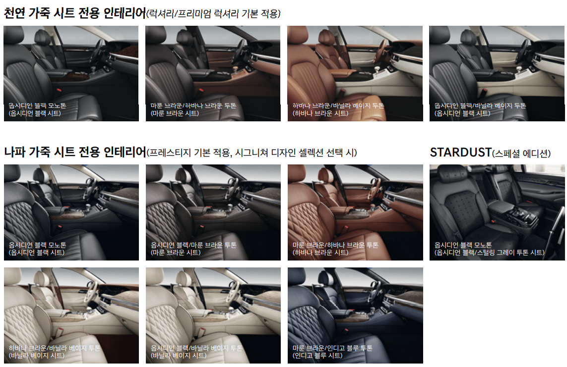 가죽 시트는 천연 가죽시트 4가지, 나파 가죽 시트 7가지가 선택 가능 하며, 2021 제네시트 G90L은 프레스티지 트림이기 때문에 나파 가죽 시트 전용에서 선택이 가능 합니다. 스페셜 에디션은 제외 됨으로 6가지 중 선택 하시면 됩니다.