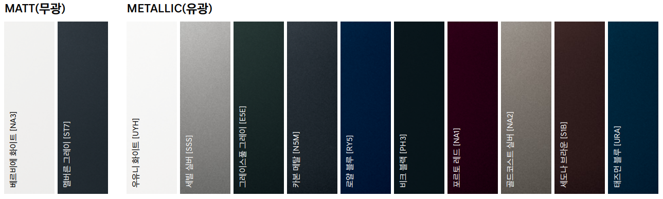무광은 2가지 색상, 유광은 10가지로 외부 색상이 선택이 가능 합니다. 무광을 튜닝이 아닌 선택 옵션사항으로 들어가있는것이 상당히 좋습니다.