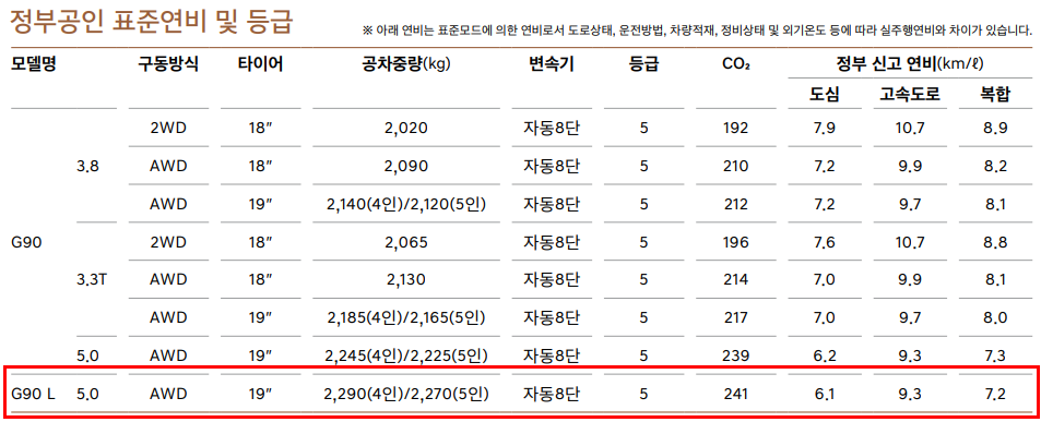 최종 트림인 만큼 연비도 가장 떨어지는 편 입니다. 복합연비도 7.2로 G90 5.0 트림과 0.1 정도 차이가 납니다. 사실 제네시스 G90L 탈 정도면 연비를 신경 쓰진 않을테니 간단하게 정보로 봐주시기 바랍니다.