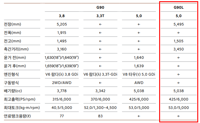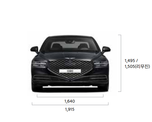 2021 제네시스 G90L 전장 5,205 전폭 1,915 전고 1,495 입니다. 전장은 5m가 넘어 굉장히 큰 사이즈 입니다. 연료탱크 용량은 83L, 구동방식은 AWD 입니다.