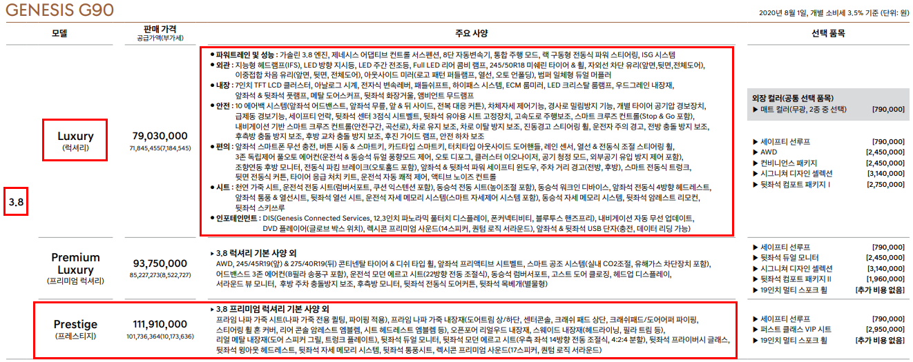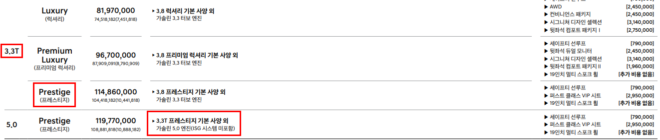 거의 최종적인 풀옵션이라고 생각하시면 됩니다. 제네시스 G90 5.0 프레스티지 에서 한단계 더 업그레이드 된 트림이라고 생각하시면 됩니다. 다음은 패키지 선택 품목에 대해서 알아보도록 하겠습니다.