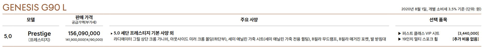 2021 제네시스 G90L 가격 대한 내용 입니다. 가격은 156,090,000원 입니다. 주요사양을 확인 해보면 기본 트림이 어떤 것인지 확인 해야 합니다. 하단 이미지를 참고 해주시기 바랍니다.