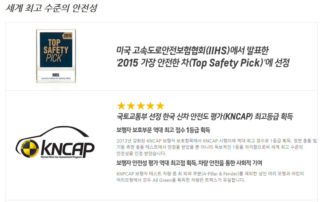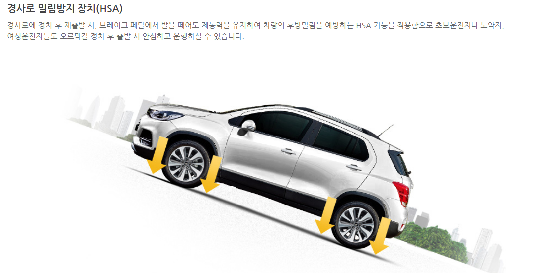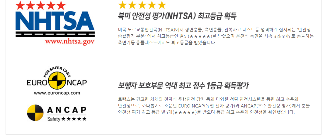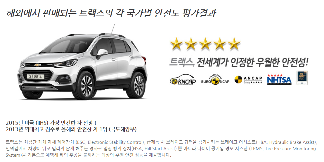 그 외에 타이어 공기압 경고시스템, 경사로 밀림방지 장치(HSA) 듀얼 프리텐셔너 등 더 많은 기능들이 있습니다. 그리고 이러한 안전성을 바탕으로 해외에서 판매되는 트랙스는 국가별 안전도 평가가 굉장히 높습니다.