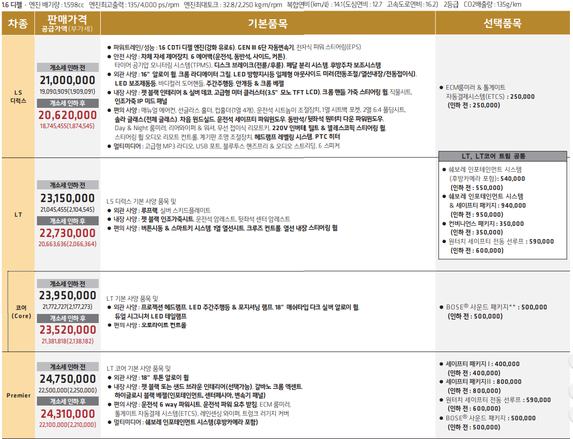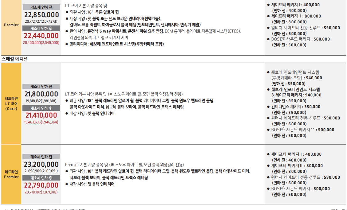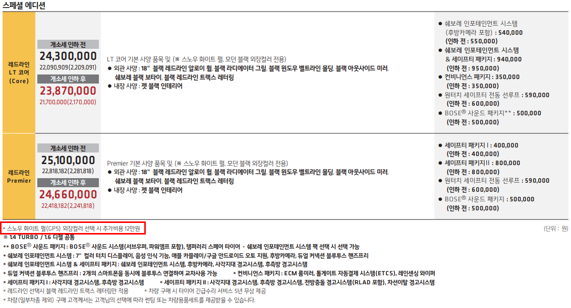 트림은 총 크게 3가지 LS. LT, 프리미엄 입니다. 그리고 스페셜 에디션이 라인인 레드라인 LT 코어, 레드라인 프리미엄이 있습니다. 개인적으로 안전성을 많이 고려하는 편이기 때문에 기본 트림에 세이프티 패키지 1,2를 추가 하시는 것도 고사양 트림처럼 이용하시는 방법 입니다. 참고하시기 바랍니다.