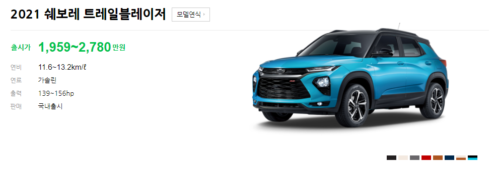 지금까지 2021 쉐보레 트레일블레이저 가격 가격표 연비 제원 색상 내부 휠에 대해서 알아봤습니다. 차량 구매하시기전 정보를 최대한 알아두고 방문 하시면 더욱 차를 고르시는데 도움이 되니 잘 참고 하시고 좋은 차량 구매하시기 바랍니다.