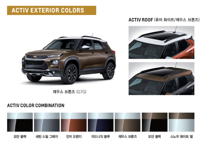 다음은 ACTIV EXTERIOR 컬러 입니다. 콤비네이션으로 컬러 색상 조합이 가능 합니다.주로 브론즈, 블랙 계열로 화이트와 그레이로 조합하여 투톤을 하실 수 있습니다. 자세한 조합은 상단의 이미지를 참조해주시기 바랍니다.