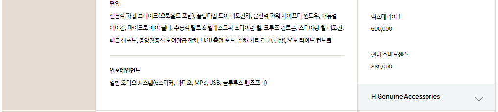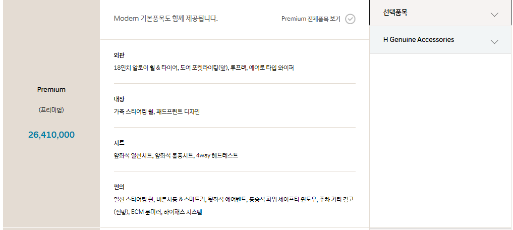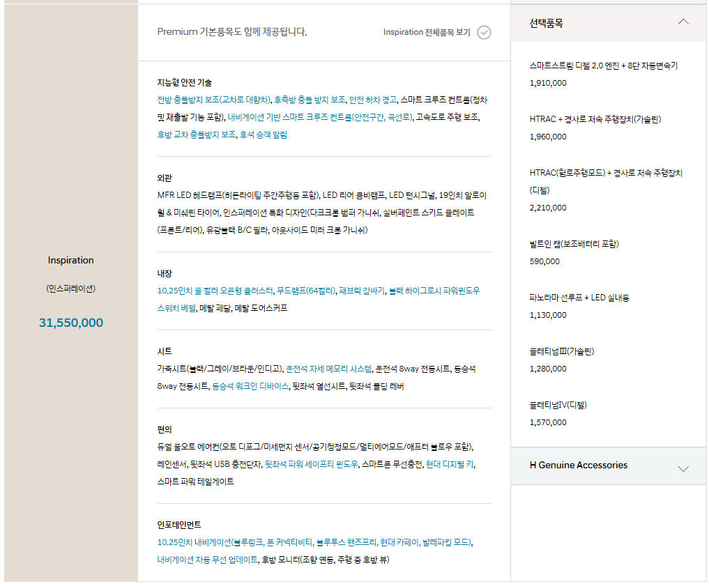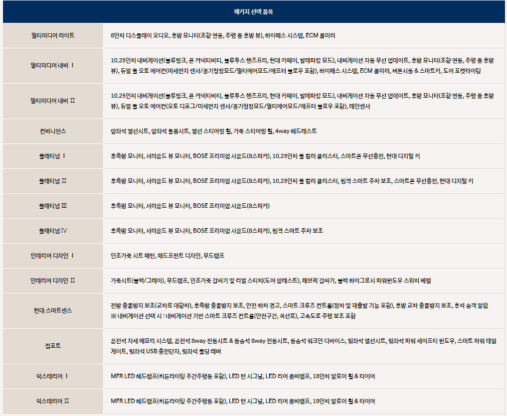 패키지 항목은 필요하신 분들은 살펴보시기 바랍니다. 추천드리는 패키지는 플래티넘 종류이며 해당 패키지가 위에서 말씀 드린 지능형 안전 기술 옵션입니다. 안전성을 가장 중시하신 다면, 기본 트림 구매 후 플래티넘 패키지를 옵션으로 추가하시는 것도 가성비 있게 차량을 구입하시는 방법 입니다.