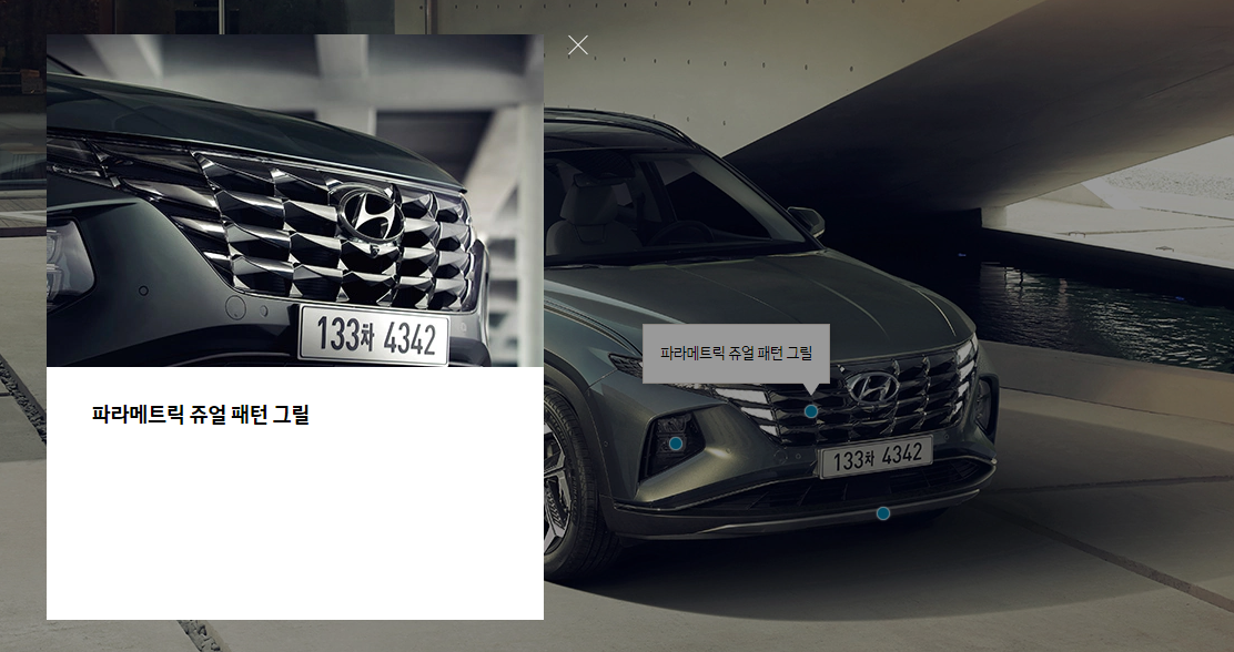 굉장히 선명하고 과감한 투싼만의 아이덴티티가 완성되었다고 생각을 하는데요. 특히 그릴부분은 각도와 반사광에 따라 보석과 같은 형상으로 보이는 파라메트릭 쥬얼 패턴 입니다.
