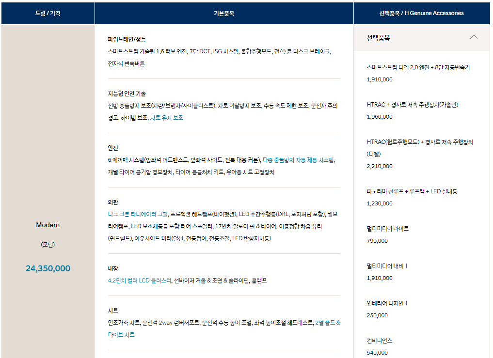 2021 투싼 하이브리드는 총 3가지 트림으로 출시될 예정 입니다. 모던, 프리미엄, 인스퍼이션이 있습니다. 하단에서 트림별 가격표 바로 확인 하도록 하겠습니다.