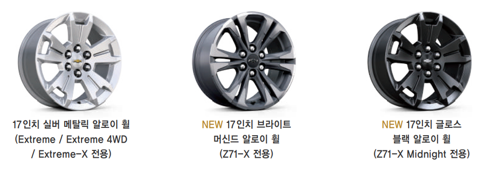 쉐보레 콜로라도 휠은 총 3가지 옵션이 있습니다. 트림별로 선택가능한 휠이 나눠져 있으니 확인 해보시기 바랍니다. 스페셜 에디션의 경우 17인치 글로스 블랙 알로이 휠로 블랙 색상으로 준비되어 있습니다.
