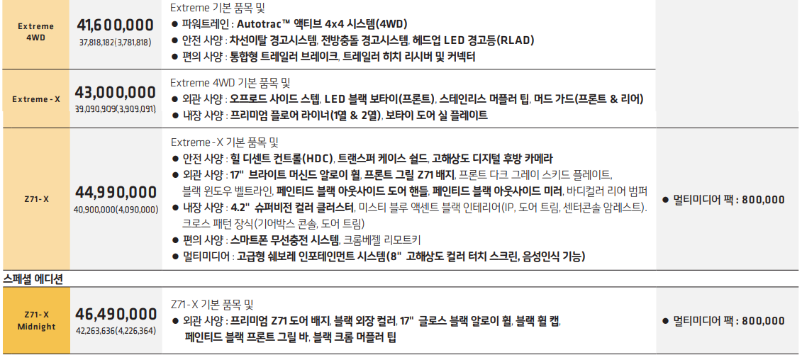 콜로라도 Extreme 4WD - 41,600,000원 안전사양은 차선이탈 경고시스템, 전방충돌 경고시스템 등 추가 됩니다.
