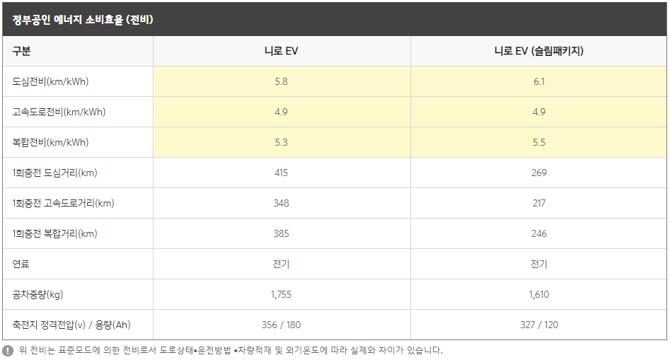 니로 EV 연비는 1회 충전 시 트림별로 옵션에 따라 주행거리가 달라집니다. 슬림패키지를 적용 하지 않을때 주행거리가 더 길어짐을 참고 하시기 바랍니다.