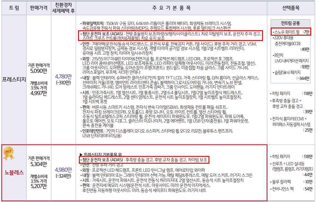 프레스티지 트림은 개별소비세 및 친환경차 세제혜택을 받으시면 4,780만원 입니다. 노블레스는 4,980만원으로 약 200만원 정도 차이가 납니다. 개인적으로는 첨단 운전자 보조 기능이 풀옵션으로 들어가 있는 것을 추천 합니다. 운전자의 안전한 드라이브를 돕는데 큰 역할을 하기 때문입니다.