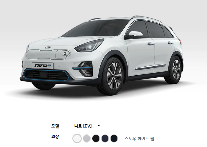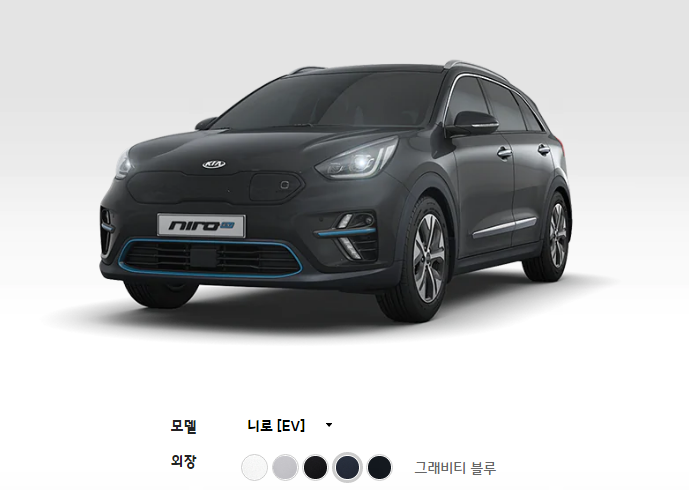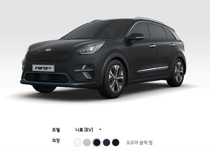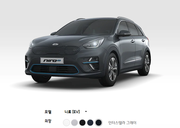 니로 EV는 5가지 색상이 선택 가능 합니다. 스노우 화이트 펄, 실키실버, 오로라 블랙 펄, 그래비티 블루, 인터스텔라 그레이 입니다. 특별하 포인트 색상이 없다는 점이 장점이자 단점 입니다.