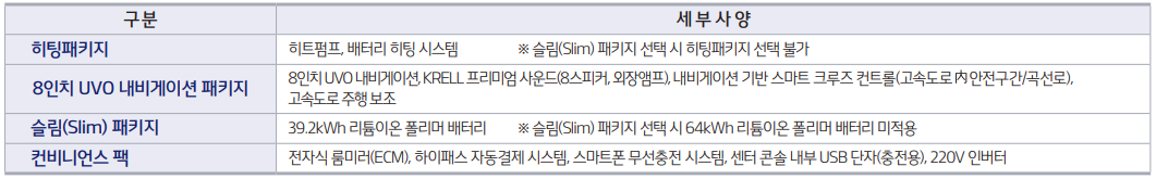 다음은 옵션 사항에 대한 세부사항 안내 입니다. 히팅패키지 같은 경우는 118만원으로 히트펌프와 배터리 히팅 시스템 입니다. 필요하신 옵션을 확인 하시고 선택하시기 바랍니다.