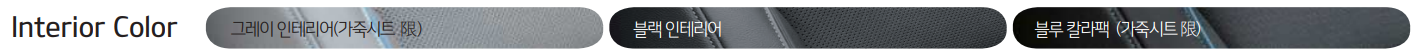 내부 인테리어 색상은 총 3가지로 선택 가능합니다. 그레이 인테리어, 블랙 인테리어, 블루 칼라팩 인테리어 입니다.